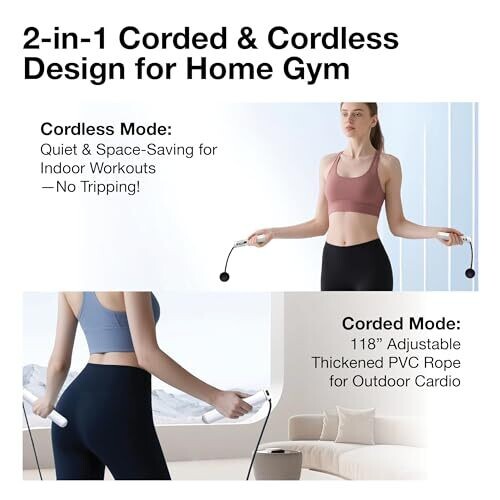 - Versatile 2-in-1 design offers cordless training for quiet, indoor workouts and a traditional rope option for outdoor use—a comprehensive home fitness essential.