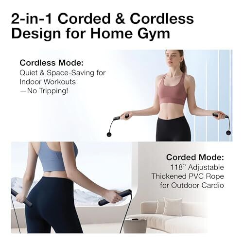 - 2-in-1 design supports both cordless training and traditional rope use for indoor and outdoor workouts.