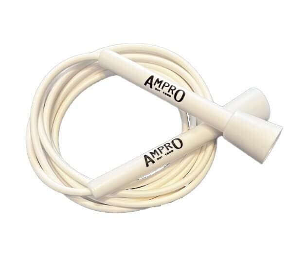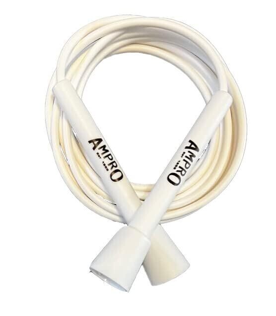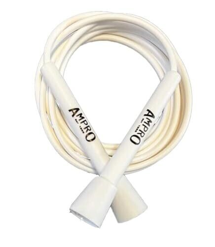 Ampro Adjustable Speed Skipping Rope in white, designed for cardio, skill drills, and general training. Lightweight, adjustable length, smooth bearings, and a sturdy handle for consistent rope spins. Great value for beginners to pros seeking efficient cardio workouts.