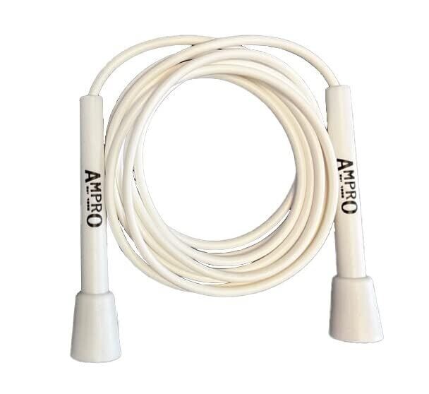 Ampro Adjustable Speed Skipping Rope in white, designed for cardio, skill drills, and general training. Lightweight, adjustable length, smooth bearings, and a sturdy handle for consistent rope spins. Great value for beginners to pros seeking efficient cardio workouts.
